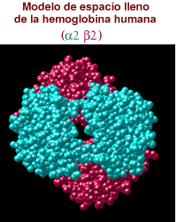 Solo está presente si hay mas de una cadena polipeptídica. Con varias cadenas polipeptídicas, la estructura cuaternaria representa su interconexión y organización. Esta es la imagen de la hemoglobina, una proteína con cuatro polipéptidos, dos alfa-globinas y dos beta globinas. En rojo se representa al grupo hem (complejo pegado a la proteína que contiene hierro, y sirve para transportar oxígeno).